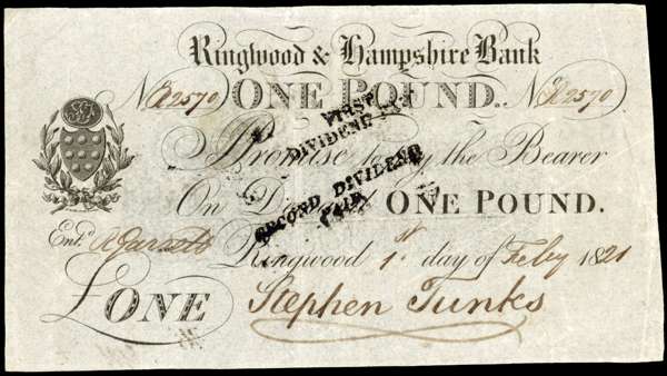 RINGWOOD, Ringwood & Hampshire Bank, for Stephen Tunks, £1.,1 February 1821, serial number R2570, Stephen Tunks signature, town arms l. (Outing 1788b) Couple of pinholes, otherwise about Extremely Fine.