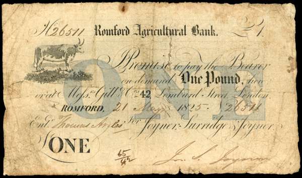 ROMFORD, Romford Agricultural Bank, for Joyner, Surridge and Joyner, £1.,21 May 1825, serial number 26511, blue ONE, J Joyner signature, vignette of cow upper l. (Outing 1823a). Almost Fine, printed bankruptcy notice on rev.