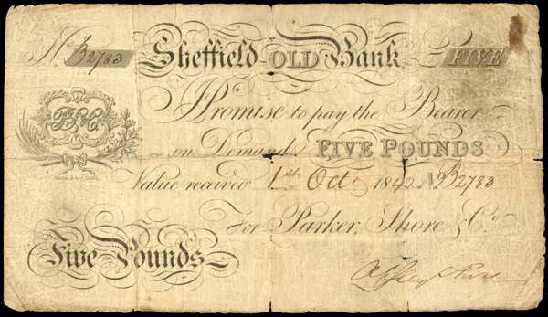 SHEFFIELD, Sheffield Old Bank, for Parker, Shore & Co., £5.,1 October 1842, serial number B2783, signature of Ottley Shore, (Outing 1928f). About Fine, a couple of small edge rips and a small tear in centre, scarce.