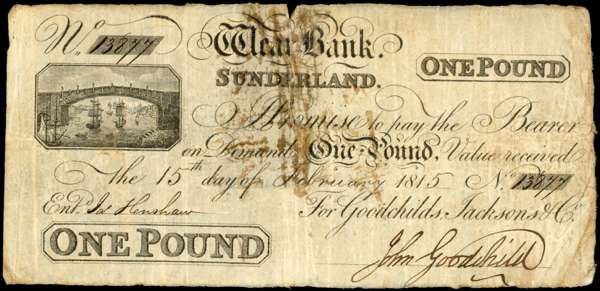 SUNDERLAND, Wear Bank, for Goodchilds, Jackson & Co., £1.,15 February 1815, serial number 13877, John Goodchil…