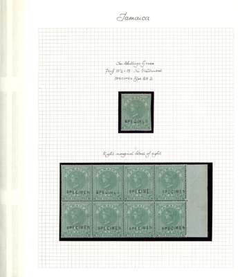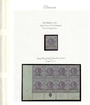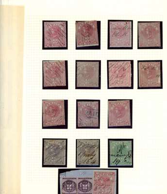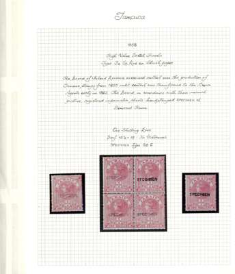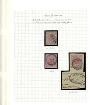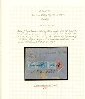 1858 Postal Fiscal issue superb collection on 7 pages including Specimens Type GB6 singles (4) and 1s block of four, 5s lower left corner plate block of eight (4x2) and 10s right marginal block of 8 (4x2), 1s rose with manuscript 'specimen', (two types), revenue usage of 1s (12), 5s (2) and 10s, plus the discovery example of the 1s BISECT on document piece, and postal usage of the 1s (3). A wonderful lot, the large Specimen multiples spectacular.