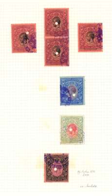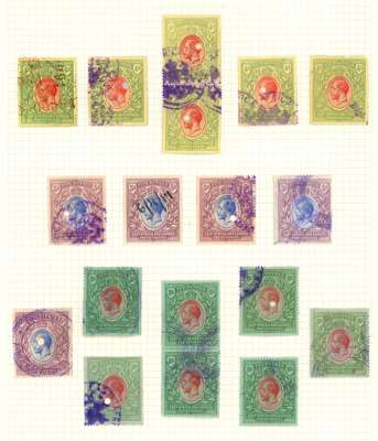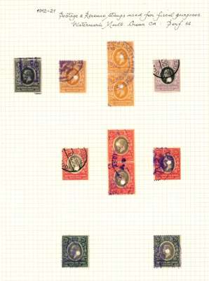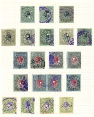 1912-21 1c to 100r group of 59 postage values to 100r comprising 1c, 10c (3), 25c (4), 50c, 75c (2), 1r(8), 2r (8), 3r (4), 4r (6, including horizontal pair), 5r (5), 10r (7), 20r black and purple/red (2), and purple and blue on blue (2), 50r (2) and 100r (2), variously fiscally cancelled with many punched. A fine group showing a wide variety of revenue applications. SG 44/62
