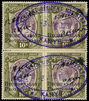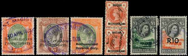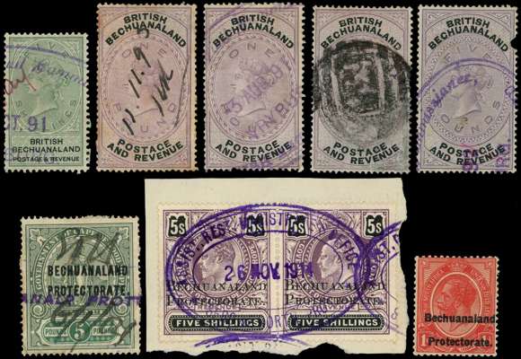1887-1961 used collection (20) on stock cards, comprising 1887 1s to £5 keyplate issues used (the £5 damaged), 1903 Cape Standing £5 green overprinted 'BECHUANALAND/ PROECTORATE' in block font (a rarity), KEVII 5s lilac & black, pair fine used on piece, KGV 1914 opts on South Africa (6) including 10s block of four, 1922 1d red (creased) and 2s6d orage & green, and QEII 1955 £1 green & black and 1961 R10 on £5 orange & black. A good representative lot.
