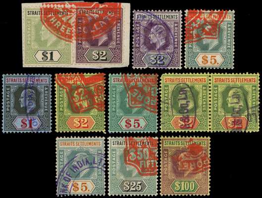 1902-12 KEVII collection of Small format issues fiscally used, (12) including $5 dull green and brown-orange showing 'Damaged Frame and crown' (unlisted in used condition), 1902-03 $100 purple and green on yellow, and 1904-10 $25 grey-green and black. A very fine group. SG 138ab, 122, 139