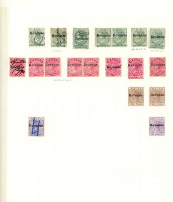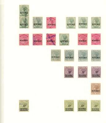 1899-1955 collection on pages, covering most issues including 1899 local opts (19) to 1s, ½d and 1d with doubled opt, 1899 DLR issues (44) with values to 5s, KEVII (27) values to 2s6d, KGV mixed group (18) with values to £1, KGVI £1 (2), QEII £1 and postage stamps fiscally used including document pieces (9) etc. Condition mixed in places but a good basis to build on.