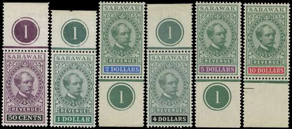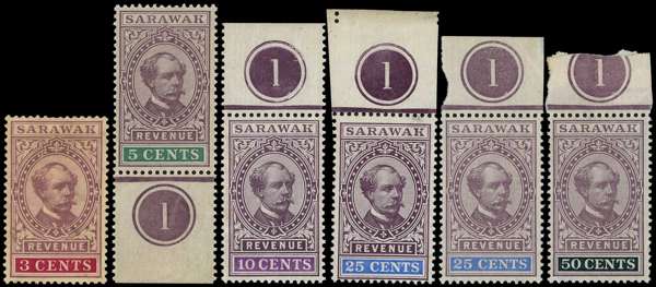 1900 Charles Brooke 3c to $10 set of 10, with additional type 2 25c and 50c, fresh unmounted o.g., all but the 3c (unused) and $10 exceptionally showing plate number '1' in margin. Very rare in this positional form.