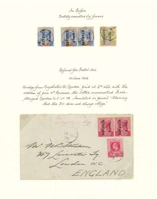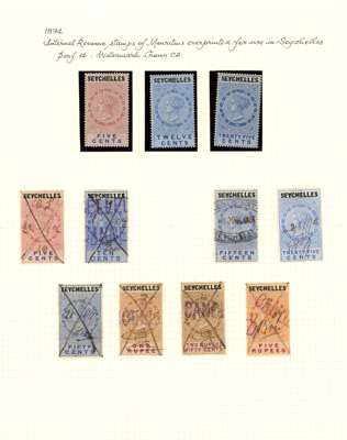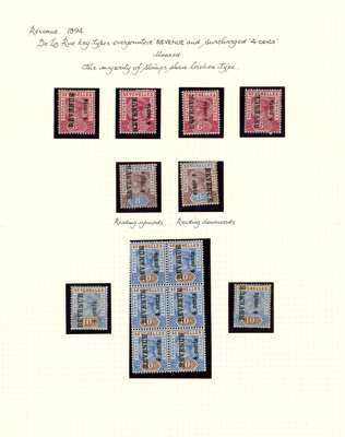 1894-1902 QV collection on album pages comprising internal revenue 1893-1903 5c to 5r set of 8 used, with 5c, 12c and 25c mint, 1894 revenue stamps surcharged 'REVENUE/ 4 cents' (39), including 4c on 10c mint block of 6, an attempted (but failed!) 1908 postal usage of 4c on 6c on cover, the stamps uncancelled, 4c on 8c tete-beche pair of both upwards and downwards reading overprint, 1902 2c brown (3), including 1 with postal cancel by favour. An attractive representative lot, worth viewing.