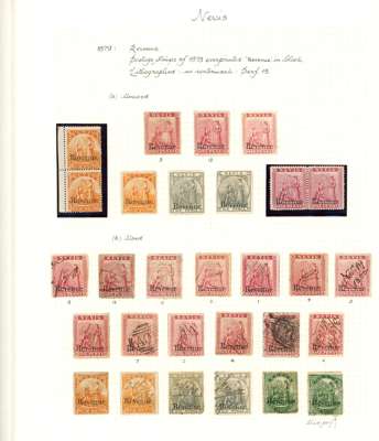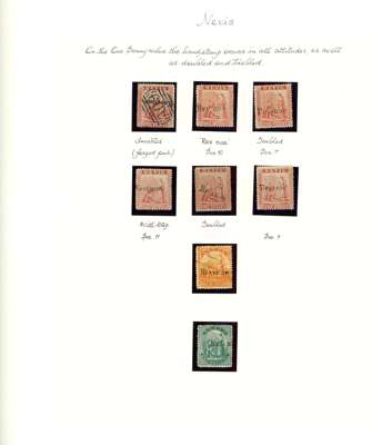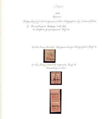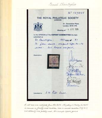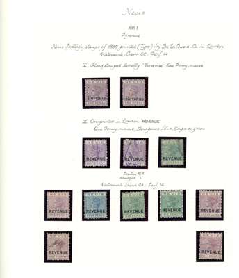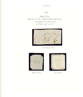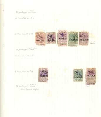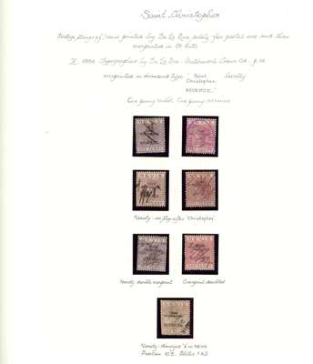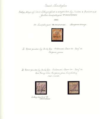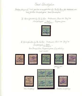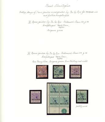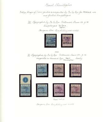 1883-84 extensive and comprehensive mint & used collection, beautifully written up featuring 'Saint/ Christopher' handstamps on Nevis issues including 4d orange complete intact sheet of 12, a detailed study of the handstamps and their use including doubles, attempted postal use, plate blocks, positional varieties, cancellations, Nevis opt 'Revenue' including partial sheet reconstruction, and 1882 unused set to 6d (SG F1/4), and De La Rue 'REVENUE' overprints including mint blocks, usage, handstamps and an extensive study. An extraordinary and highly recommended lot, the fruits of 40 years of study of these complex issues. Viewing essential.