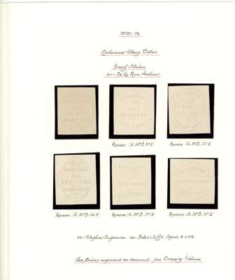 Embossed Revenue c.1900 group of six colourless proof impressions on white paper, denominated 1d, 1s, 5s, 10s, £1 and £5, with all but one initialled and marked with a die number on the reverse. A unique and highly attractive set, Ex Stephen J. Sugarman and Peter Jaffé. Mentioned but unlisted by McClellan