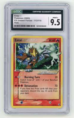 Entei Goldstar #113 Holo from EX Unseen Forces, the tenth main expansion of cards from the EX Series, released August 22, 2005 - graded an extremely impressive MINT+ 9.5 by CGC.