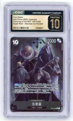 A perfect example of the Five Elders SR Alternate Art Parallel OP13-082, stunningly presented in a Pristine 10 graded CGC slab.