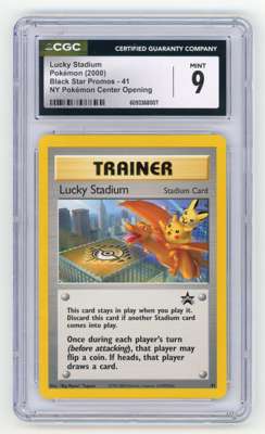 One of the two harder original Black Star Promos to acquire, this Lucky Stadium #41 Black Star Promo was given away exclusively at the New York Pokemon Center Opening. It has been graded a MINT 9 by CGC.