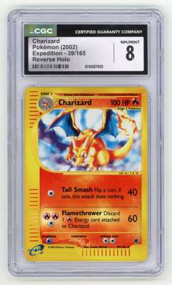 A NM/MINT 8 graded Charizard #39 Reverse Holo from Expedition, the first main expansion of cards from the e-Card Series, released September 15, 2002.
