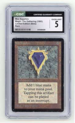 Limited Edition Beta copy of Mox Sapphire, graded an EXCELLENT 5 by CGC. As part of the Power 9, this card has a legendary status among collectors and players from all eras of Magic.