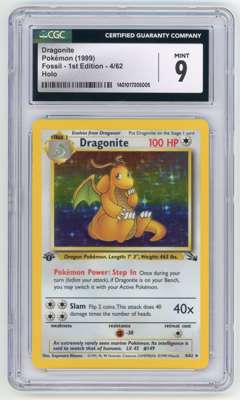 A MINT 9 graded Dragonite Holo #4 1st Edition from Fossil, the third main expansion of cards of the Pokémon Trading Card Game, released October 10, 1999. This 1st Edition printing of an already popular item further increases the value and collector appeal of this stunning card.
