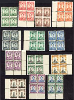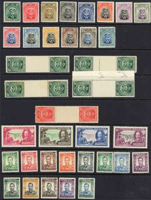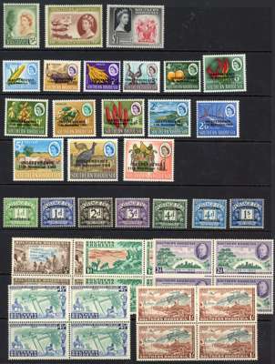 1924-53 mint balance collection on Hagners. 1924 set with most unmounted, and five items imperforate between stamps and interpanneau margins, two stained; commemoratives; 1937 set unmounted, and in blocks of four, either hinged on the top pair or on the selvedge only, also a further set of corner examples with sheet numbers, the stamps unmounted but a couple having the selvedge reinforced with sheet edging; 1937 perf 12½ 6d Specimen printer's sample in blackish brown, unmounted; 1953 set large part o.g.; Dues 4d grey-green unmounted, and the other values in unmounted blocks. Mostly good. Also 1965 Independence o.g.