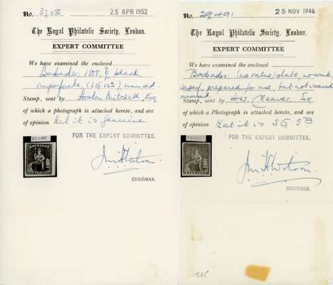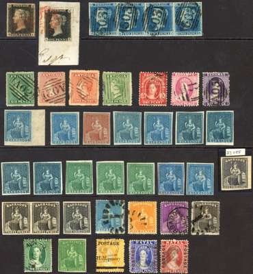 Small selection of mainly classic issues including GB 1840 1d black used x2 (one on piece) and three covers each bearing 1847-54 1s embossed, range of Barbados ‘Britannia’ imperfs including 1858 1s black unused (1952 RPS Certificate), New Brunswick 1851-60 3d used, Nova Scotia 1851-60 1d and 6d used, and range of Trinidad ‘Britannia’ issues including 1861 6d rough perf (1955 RPS Certificate), mixed condition but with many fine, a very good lot with high cat value. (106 + 3 covers)