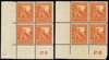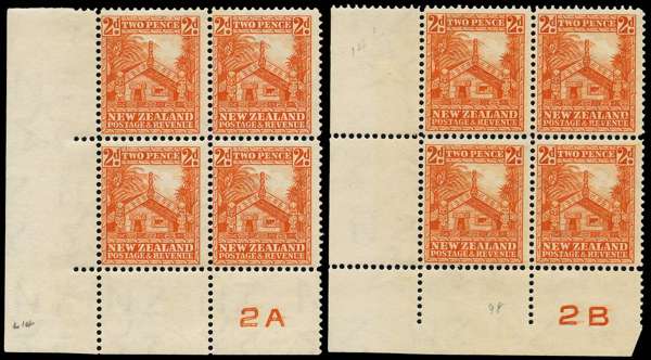 1936-42 2d orange 'Maori Carved House', wmk 98, perf 14 (line), De La Rue printing, two lower left corner blocks of 4, respectively from plate '2A' and '2B', fresh o.g. (lower pairs unmounted). A fine and very scarce pair. CP L4c