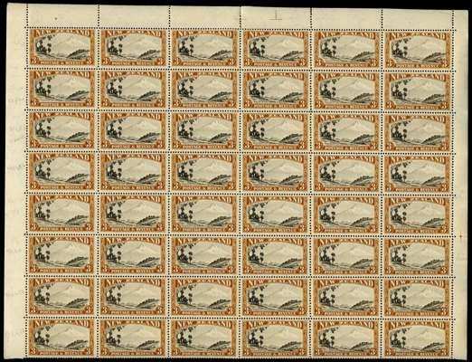 1936-42 3s chocolate and yellow-brown 'Mount Egmont', wmk 98, perf 14x13½, block of 48 (6x8) being the upper eight rows of a sheet with full margins sheet markings, fresh o.g. (stamps mostly unmounted). Minor separation still a fine and interesting piece, showing the R6/6 flaw 'brown line across peak' and numerous minor re-entries. CP L14gX.