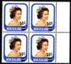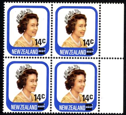 1979 14ct on 10ct Queen's portrait, u/m marginal block of four showing surcharge double, one albino on each stamp. SG...