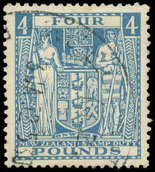 Postal Fiscal. 1931-40 £4 light blue, 'Cowan' paper, wmk w43, lightly cancelled by large part 'WELLINGTON' cds, dated '3 JA 52' (with time code '5.30(PM)', proving postal usage). RPS cert (2004).