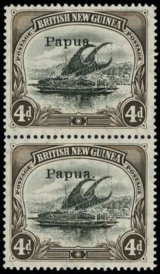 1906 4d black and sepia vertical pair with watermark vertical, Brisbane overprint, fine large part o.g. The lower stamp with R4/3 deformed ‘d’ at left, vey unusual in pair with normal. SG 42, a, £800
