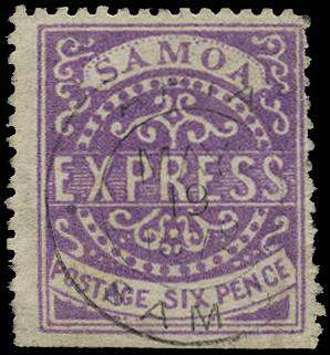 1877-80 'EXPRESS' 6d bright violet, 2nd state, perf 12½, lower marginal (pos. 7), centrally cancelled by light APIA cds, dated 'MAY 19 1879'. Typical perfs and minor creasing, still a pleasing example of this very scarce stamp.