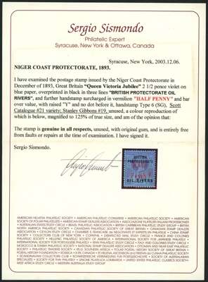 1893 ½d on 2½d handstamped Type 6 in vermilion, slightly browned hinge remainder and a few clipped perfs at base, Several pencil signatures including Sismondo, and with his certificate (2006). SG 19, £650