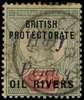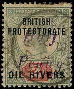 1893 ½d on 2½ handstamped Type 7 in violet, used with Old Calabar River CDS; toned, some colour loss and pen note on reverse. SG 20, £275