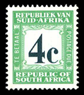 Postage Due. 1967-71 4c deep myrtle-green and emerald, wmk w127 (upright), Afrikaans at top (type D6), unmounted o.g. Natural indentation at lower left (apparently from perf waste) barely detracts from fine appearance.