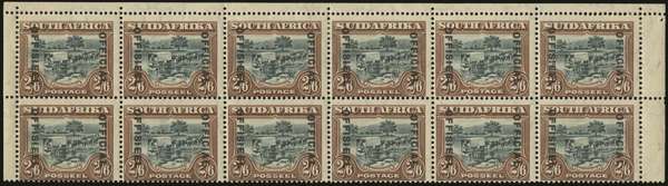 Official. 1929-31 "Set 6" (= 1931 issue) 2s6d green and brown, London printing, SG type O2 opt (18-19mm space), block of 12 (R1-2/1-6) being the top two rows of a left pane with full margins, large part o.g. Typical centring, and a couple of minor imperfections (part separation between R2/2-3). Ex Matheson. [Union Handbook O25]