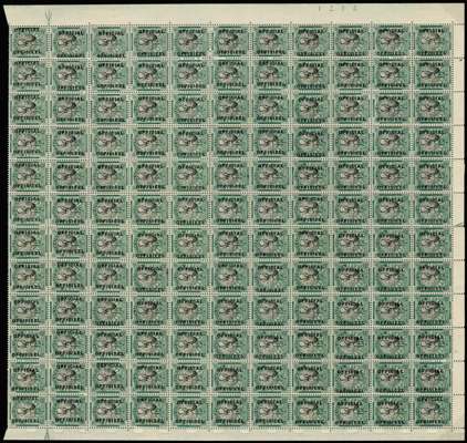 Official. 1930-47 "Set 6" (= 1931 issue) ½d black and green roto, "SUIDAFRIKA" one word, SG type O2 opt with erratic 9½-12½mm spacing, block of 132 (12x11) being rows 10-20 of a sheet with full margins showing left, right and bottom "arrows", cyclometer number "2171", and a host of opt varieties, including "Stop after OFFISIEEL on English stamp" at R19/10 and 12, and "Stop after OFFISIEEL on Afrikaans stamp" at R15/3 and 11, and R18/12, and many others of equal technical interest, fresh o.g. (most stamps unmounted). Some separation (between the top two rows, and columns 6 and 7), but very fine appearance and an absolutely fascinating item, preserving the complete 12x10 setting with extra row at top (R10) matching the bottom row (R20). [This was the final modified state ("S-C4") of the old 12x10 setting with the five "Stop" varieties, used only for this value, and now incorporating "repeat" varieties (H&M v11-13) on adjacent positions, which await final explanation.] Ex Matheson, and illustrated (columns 1-10 only) on Hisey & Matheson p.24. [Union Handbook O20, v1-7 etc]