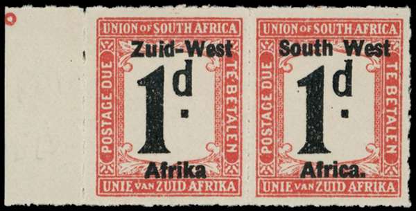 1923 1d black and rose postage due, l/h marginal horizontal pair, l/h stamp showing R 6/1 'Afrika' without stop variety, unmounted o.g. SG D7b £150