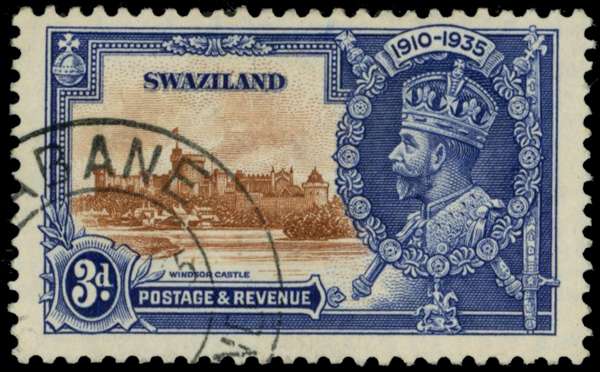 1935 3d Silver Jubilee showing Plate 1, R 9/1 'extra flagstaff' variety, cancelled with forged Madame Joseph (MJ 408) cds. SG 23a