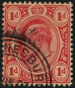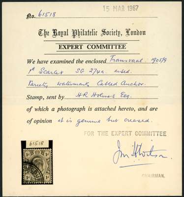 1906 1d scarlet with watermark error Cabled Anchor, used with part Johannesburg CDS, fine save for unobtrusive corner crease. RPS Certificate (1967). SG 274b, £350
