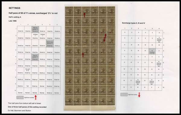 1898 (Jan) "2½" on 1a6p sepia, type 1 opt with surcharge types 3/4/5 in red, PANE OF SIXTY (6x10, with margin at foot showing part centre guide below R10/6, being the lower left quarter of a sheet), comprising an intact block of 58 and a vertical pair (R3-4/6, positions correct) inserted from another pane, fresh o.g. with most stamps unmounted. The surcharge setting shows types 3 (x26, at R1-2/1-6, R3/1, R4/6, R5/1-6, R6/1, 3-4, and R10/5-6), 4 (x10, at R3/2-6, R4/2-5 and R10/4) and 5 (x24, at R6/2, 5-6, R7-9/1-6 and R10/1-3) se-tenant, while the "Zanzibar" opt is from the final setting 4 (= Hall's setting "A") of Oct 1896, which has small second "z" on all but eight positions, being "normal" on R5/1 (surcharge type 3), R9/4 (type 5), R10/1-4 (type 5 on 1-3, type 4 on 10/4) and R10/6 (type 3), but "tall" on R9/2. [The most distinctive varieties in this setting are "Narrow capital Z" at R1/3 and "Daun's capital Z" at R5/3.] In remarkably fine condition (just minor reinforcements) and a fascinating and wonderful item of the highest importance and rarity, with comprehensive charts detailing both opt and surcharge settings.