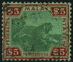 1934 $5 green and red on green paper, lightly used with Telok Anson 1935 CDS (Proud D9). Perfs at lower left a little trimmed. SG 81, £325