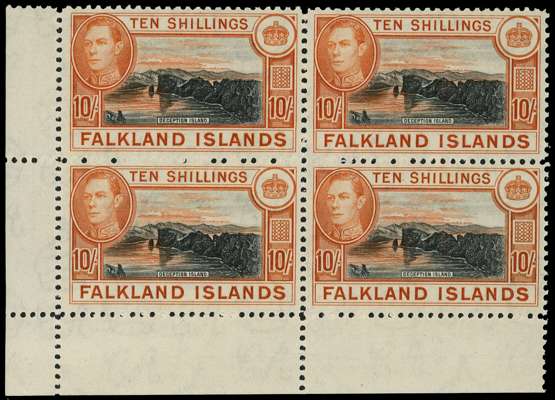 1944 printing of the 10/- in black and red-orange lower left corner block of four, o.g., lightly hinged on top pair only. Gum very slightly two-toned. SG 163b, £520