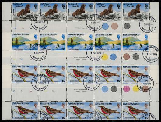 1974 Tourism 2p, 4p, 15p, 'set' of three (5p not issued in this form), each in a GUTTER BLOCK OF TEN showing plate numbers '1A', imprint and 'traffic lights', very fine c.t.o. with Port Stanley f.d.i. cds. Extremely scarce in this intact form. [N.B. Heijtz prices the set of three unused PAIRS at £150. In our experience USED pairs are considerably scarcer.]