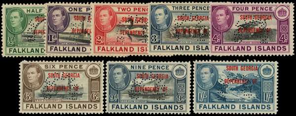 South Georgia. 1944 set of eight perforated SPECIMEN Type B9; 1d, 2d and 3d with brown o.g., the others unused without gum, some toned. SG B1s-B8s, £650
