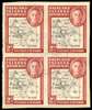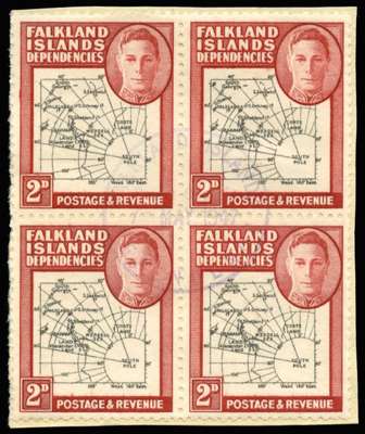 1946 "Thick map" 2d black and carmine, block of 4 showing variety "Extra island" and "Gap in 80th parallel" on upper right stamp (R3/9), lightly cancelled on piece by type SG6 "South Georgia" cds, dated "7 MAY 1947".