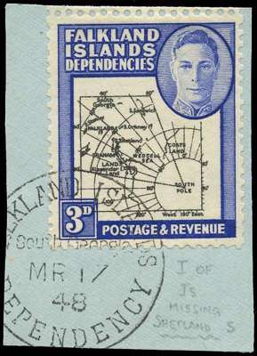 FALKLAND IS DEPS SG G4b 1946-49 Thick Map 3d "Missing I", used on piece
