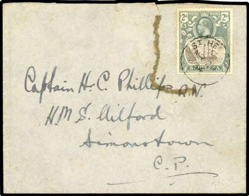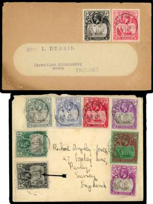 1922-37 issue, three covers with flaws. 1929 envelope to UK with ½d and 1½d, latter with torn flag; 1934 envelope to Simonstown with 2d broken mast (the stamp has been partially torn around and the tear sealed with glue, which has stained); and 1938 envelope to Surrey with set to 8d, the ½d with broken mast and the 1½d the 1937 deep carmine-red. Not the freshest group of covers but the variety stamps are fine. SG 97a, 99b, f, 100a