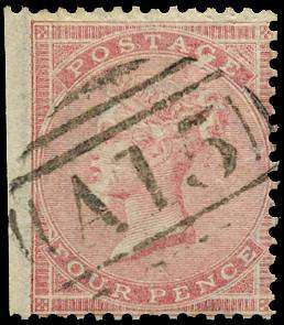 1858-60 Great Britain 4d rose, trimmed wing margin at left, with very fine 'A15' (type I - sloping '5'). Short or shortish perfs foot, still most attractive and very scarce. Illustrated on p.13 of 'Grenada The Stamps of Postal History 1763-1952' by Pearce.