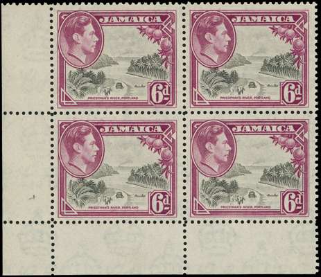 1938-50 6d grey and purple lower left corner block of four, CP (1) R10/1 ‘exhaust pipe’, o.g. Lightly hinged on top pair and selvedge, leaving the variety unmounted. SG 128aa, £400