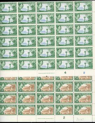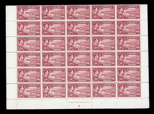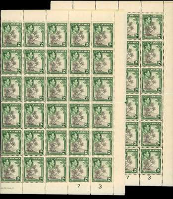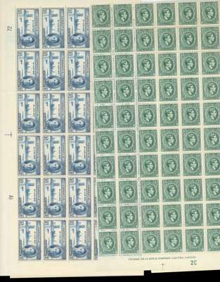 1938-52 sheets unmounted o.g. 2d perf 12½ x 13 two Plate 7-3 sheets, each with large plate crack in left selvedge; 3d ultramarine and green Plate 4-2 sheet; 4d FP 2 sheet with R8/5 large crack between the two boxes, 9/5 vignette scratch in top right corner; 9d two sheets from unnumbered plate; Victory sheets. All with some splitting. Also ½d green block of 100 with Plate 2C