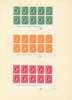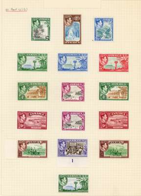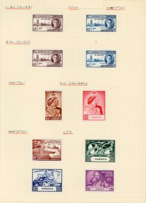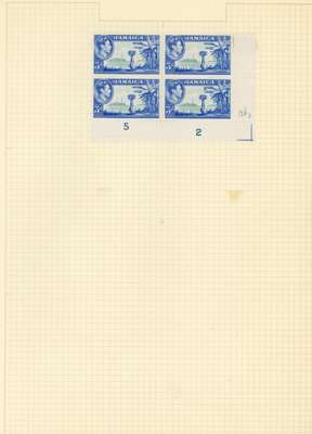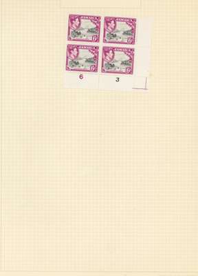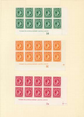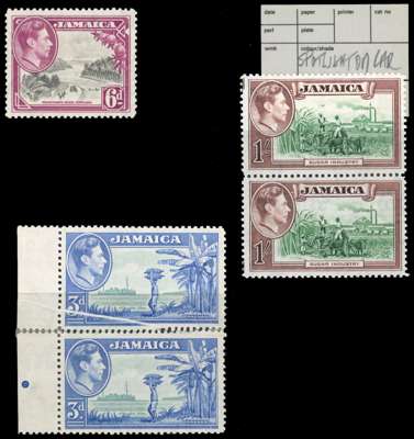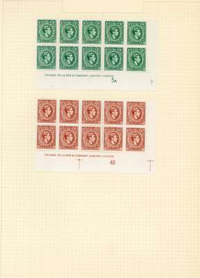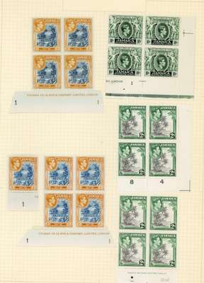 1938-52 neat mint collection on leaves lightly hinged with shades, appearing to be first hinge or unmounted (10/- perf 13 x 2, £1) and a small range of Plate blocks (includes SG 121-3 blocks of 8, 126b, 128a, 32b, 132ba and 133a blocks of four); commemoratives including Wedding. Also a card with 6d spotlight on car, 1/- vertical pair with upper stamp showing ‘flying saucer’, and 3d greenish blue and ultramarine vertical pair with a nice pre-printing paper fold giving a void area on the upper stamp and irregular perfs, slightly reinforced. SG 121-133a