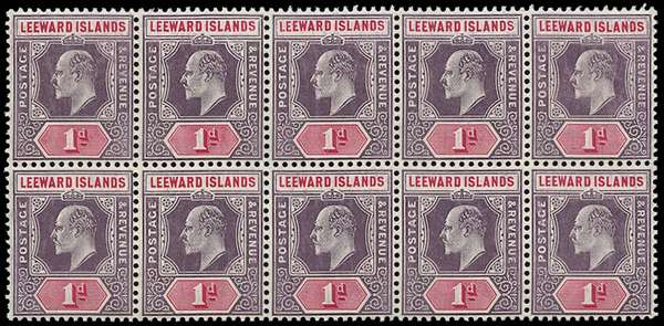 1905-08 Wmk MCA 1d dull purple and carmine, chalk-surfaced paper, block of ten (5x2) from Plate "1" left pane R1-2/2-6, showing variety "Damaged frame and crown" (the "Spaven flaw") on R1/3 (second stamp in upper row), brilliant o.g. (variety unmounted). Very scarce in an unused multiple.