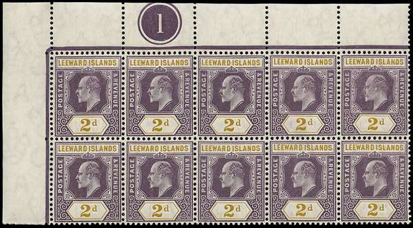 1905-08 Wmk MCA 2d dull purple and ochre, chalk-surfaced paper, upper left corner block of ten (5x2) with plate number "1", showing variety "Damaged frame and crown" (the "Spaven flaw") on R1/3, o.g. (stamps unmounted). Insignificant traces of toning on gum mentioned for accuracy, still very fine fresh appearance. An extremely scarce positional multiple, from Dec 1905 printing (100 sheets only).