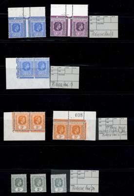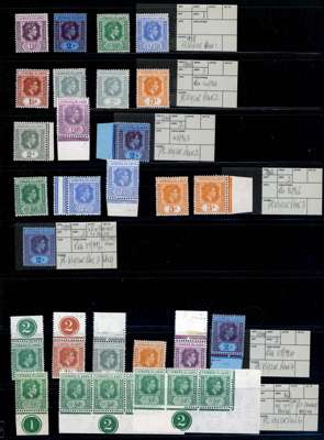 1938-44 mint group (43) with the printings mostly identified by requisition numbers, a useful group including ½d Plate 2 strips of three from the 1942 and 1944 printings, 1942 showing R10/5 RP serrated edge and 1944 the repair. Good specialist group. SG 96/111a